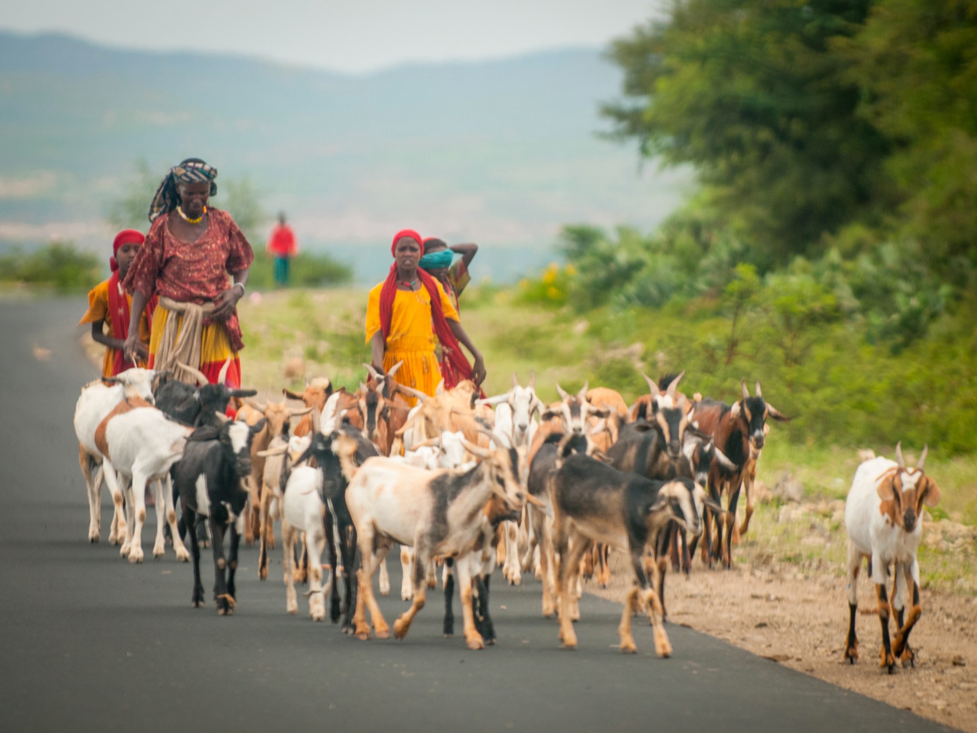 Leaving Awash NP, you would think that the road will remain in the lowland plateaus that are hot and dry. Within an hour however, we started climbing up to hills and valleys and roads with beautiful valleys on both sides. Terraces of millet, khat or qat (the leafy drug of choice in these parts) and maize went on for hours as we drove on roads that curved and hugged the green hillsides. The rain started to pour hard and I was very thankful that our driver was very competent because we had some close calls with some trucks on the way. But more than anything, I loved looking at the people along the way. Near Awash NP, you could see Afar tribesmen walking with their cattle along the road, or Kuruyu women dressed in all kinds of colours gossiping among themselves as they carried their heavy loads of charcoal to their communities. When you travel on a road, you can really get a feel for the people that inhabit the country you live in. Sometimes they will give you dirty looks. Other times (most times) they will be so curious, will want to say hi and touch your hand. Other times, they are probably just wondering (just as I wonder) who they are and what are their stories.