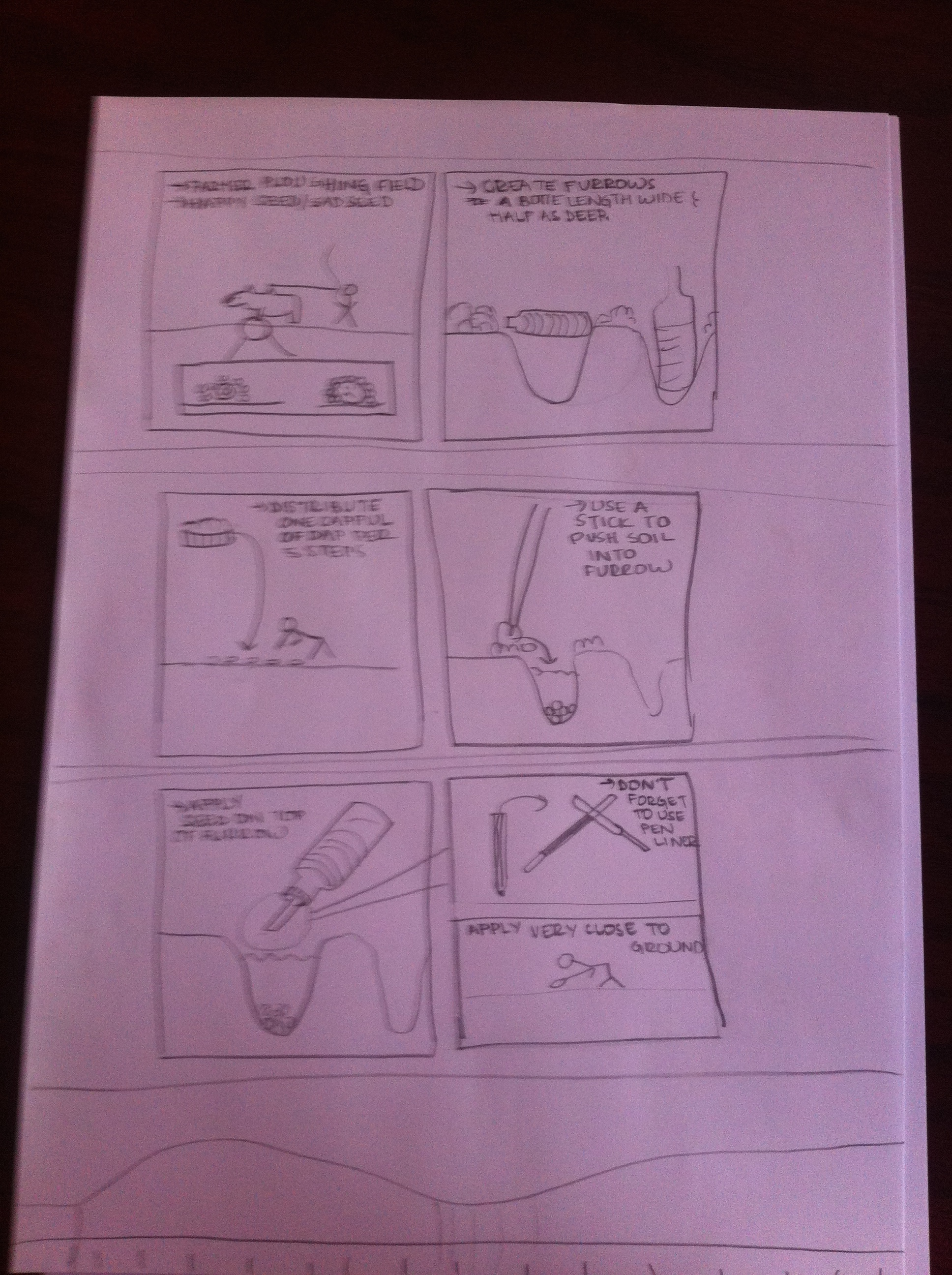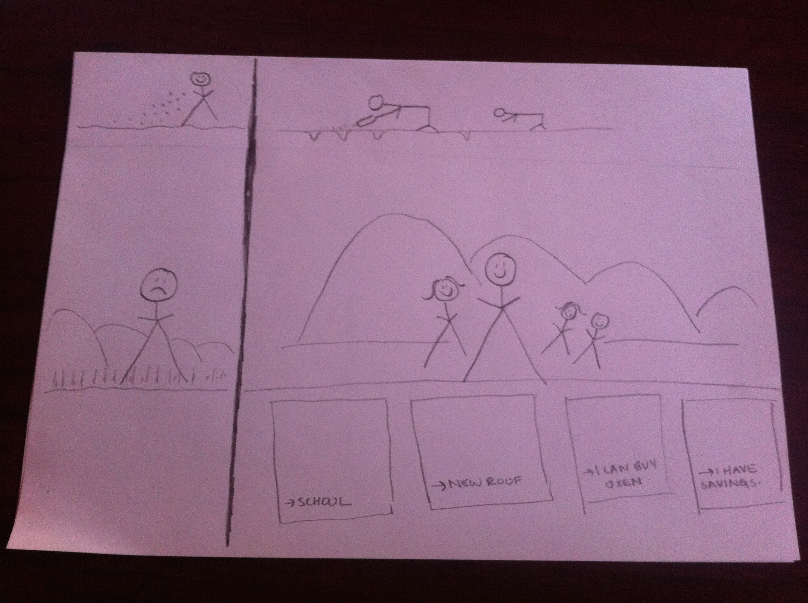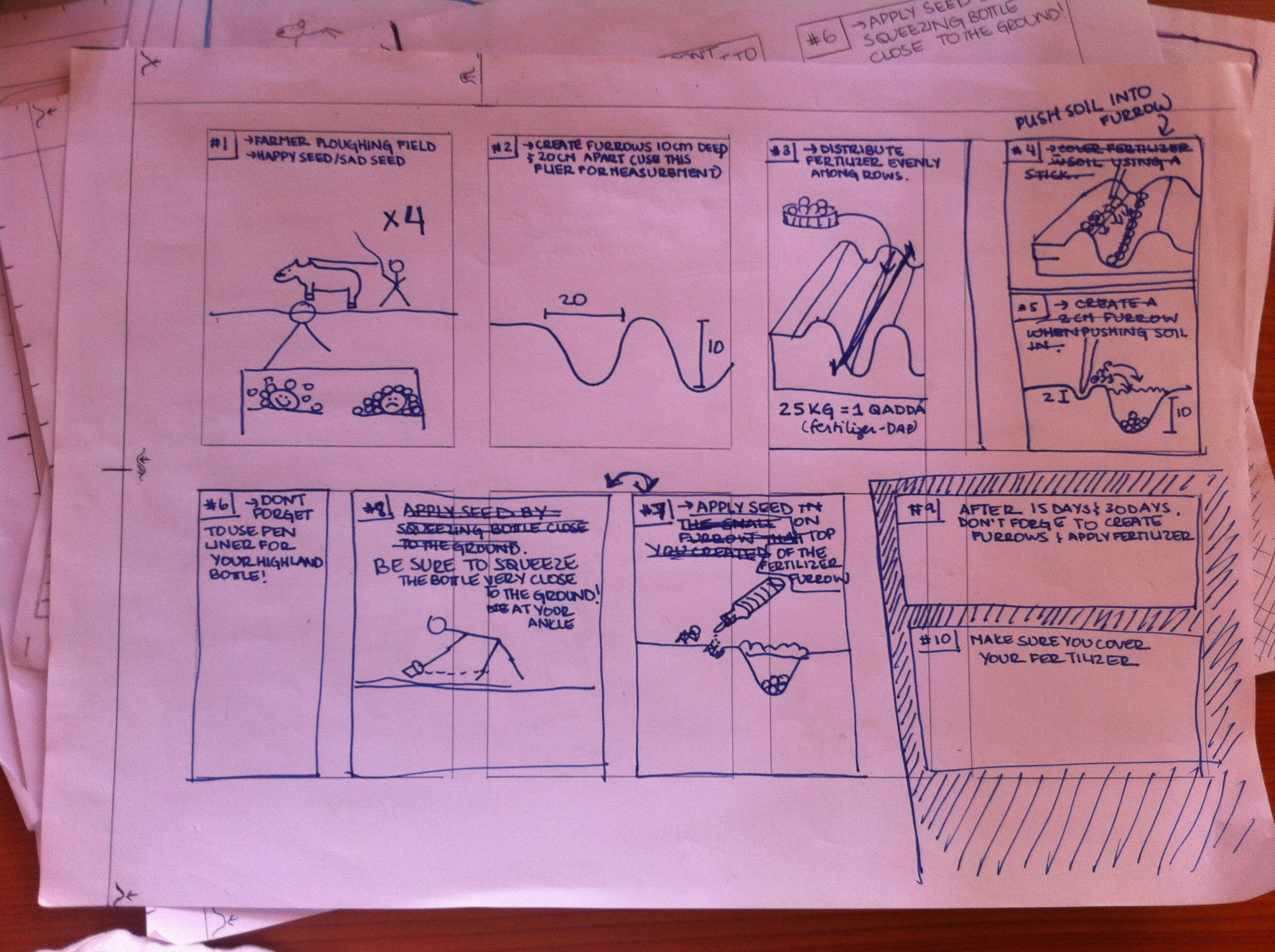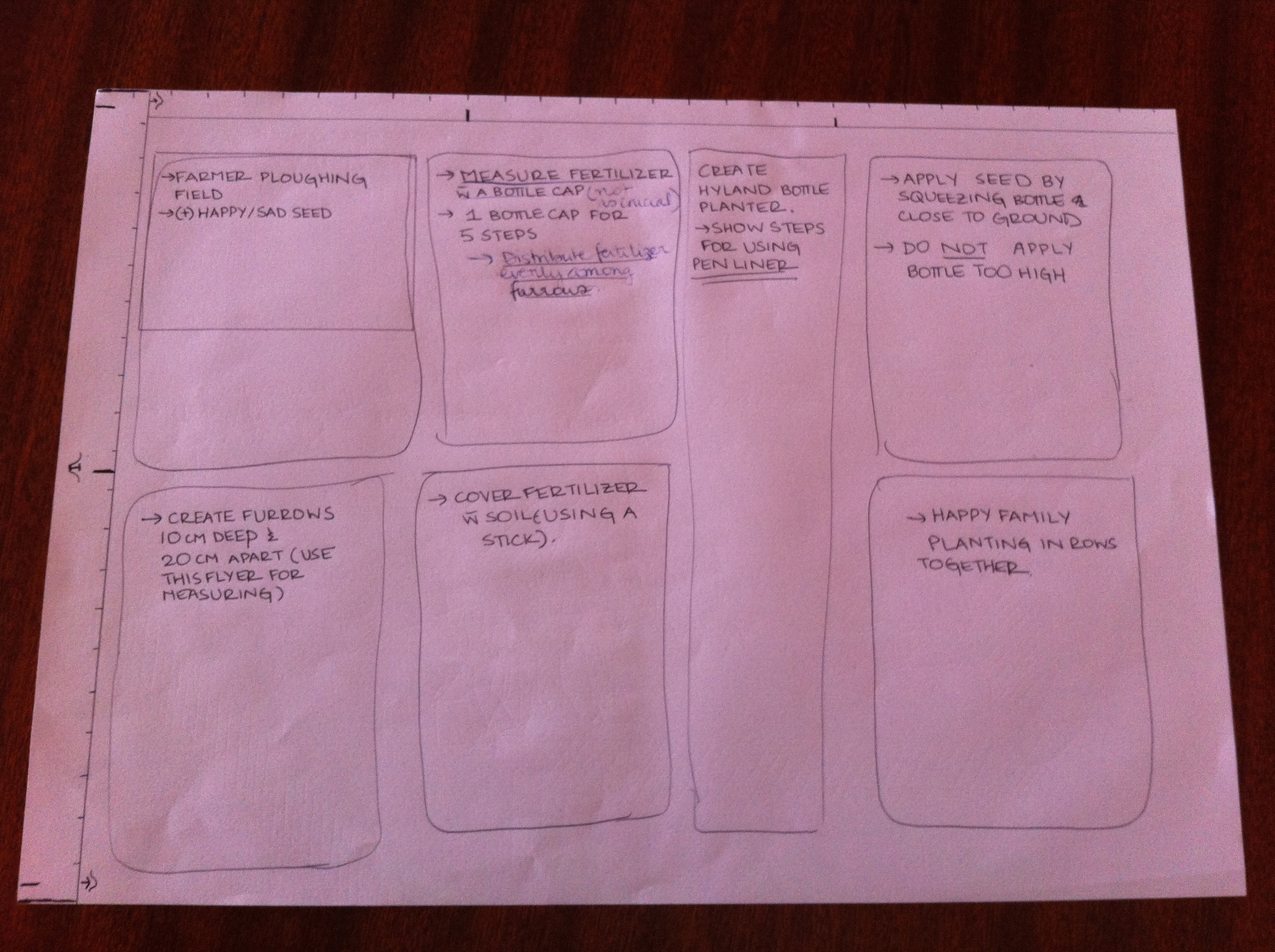 For the how side, one of the farmers we talked to thought that we were showing him steps to make tea! (I’m still not sure I see that one but it was good feedback indeed). We had included some “helpful” elements to help farmers relate to the steps, for example, furrows need to be planted in 20cm spacing and we included a bottle in the photo and the outline of a bottle and a ruler at the bottom of the page to help them measure. They almost never were able to relate these things together so we cut them out.