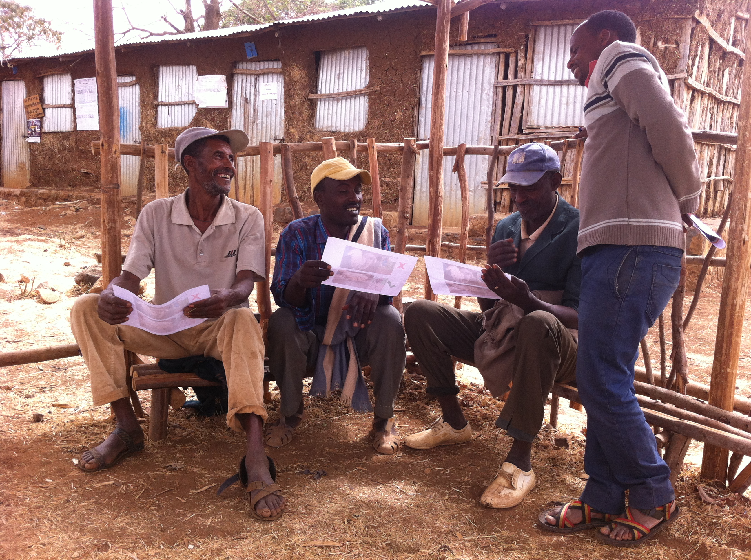 Here are photos of some of the iterations we did and my colleagues speaking to farmers, testing their understanding of various steps to see what should be included and what shouldn’t, what needs to be changed, etc. We learned so much from this. For example, even though the concept of the thumbs-up, thumbs-down and or check mark for good and “x” for bad seems pretty universal, these are culturally motivated concepts that aren’t understood by the majority of farmers we talked to. Some symbols or colors are used by political parties and we want to steer clear of that! We also learned that we needed to keep everything extremely simple, most farmers we talked to were not able to make relationships between the images of a happy family in front of a huge teff yield and the various things (going to school, buying a cow), lots of them thought that it was a poster to promote family planning.