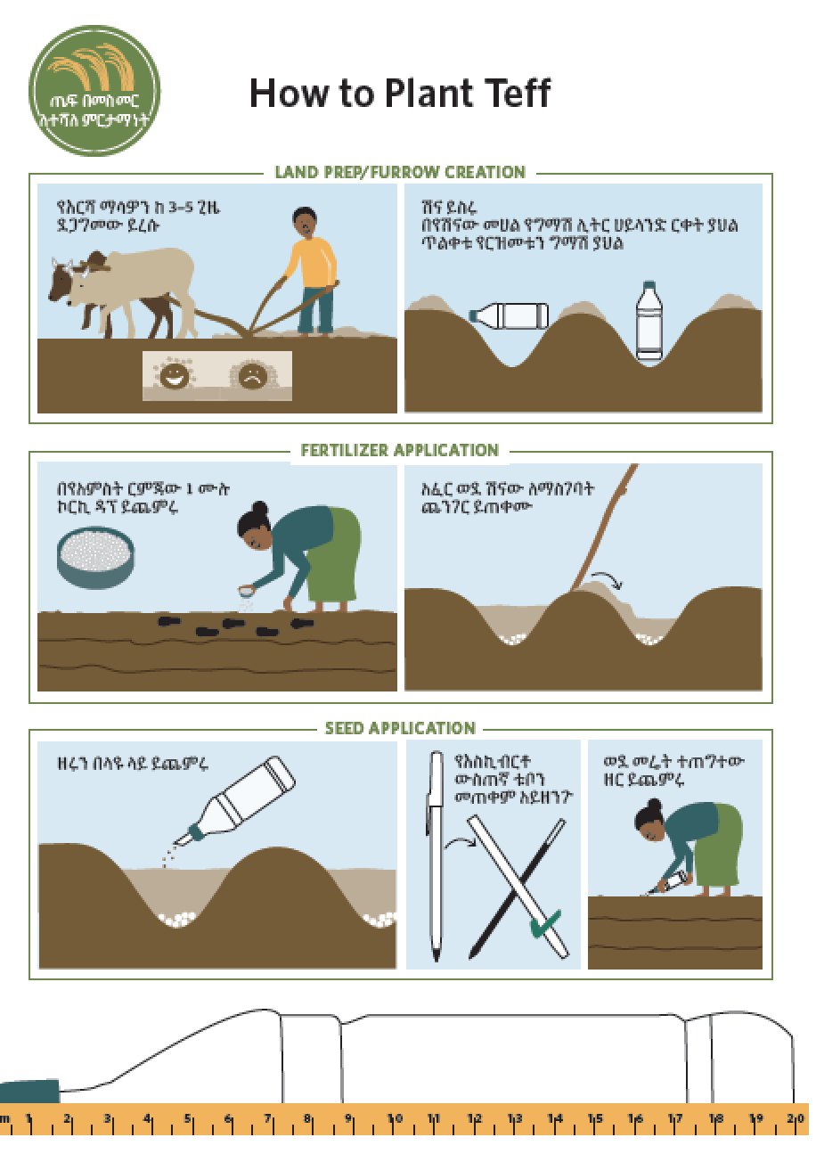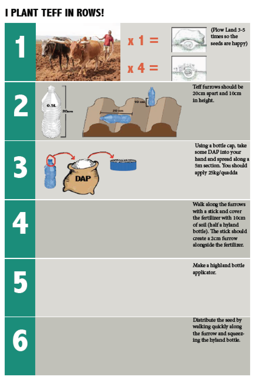 At one point, we decided that graphic design of the “HOW” steps was not working as well as we thought it would so off I went to the field to try and find a farmer to simulate a “wet” field (planting is done during rainy season) to take photos of the steps. We tried taking photos of teff grains at the market, and tried a variety of images to show row planting= good because high yield. It is a much more difficult thing than I had first imagined it would be.