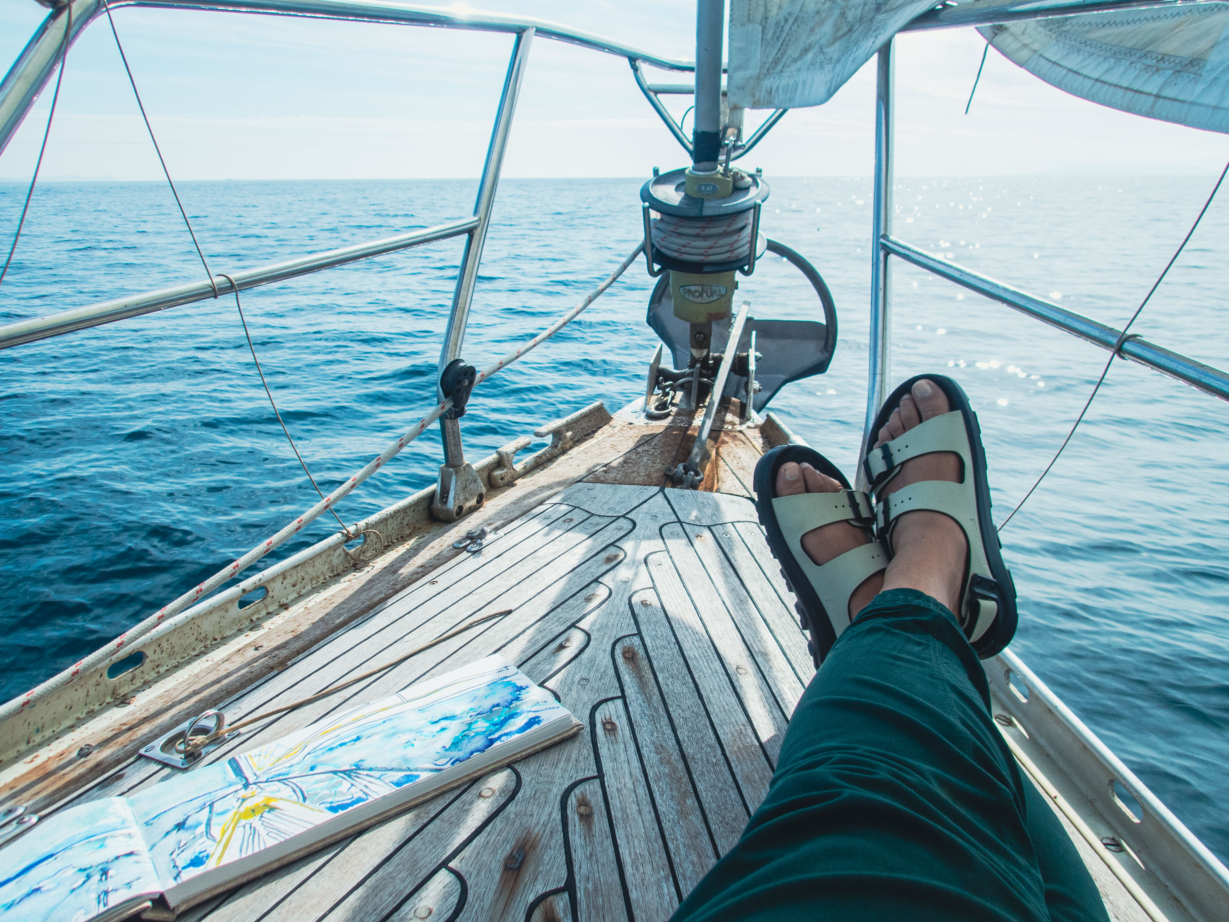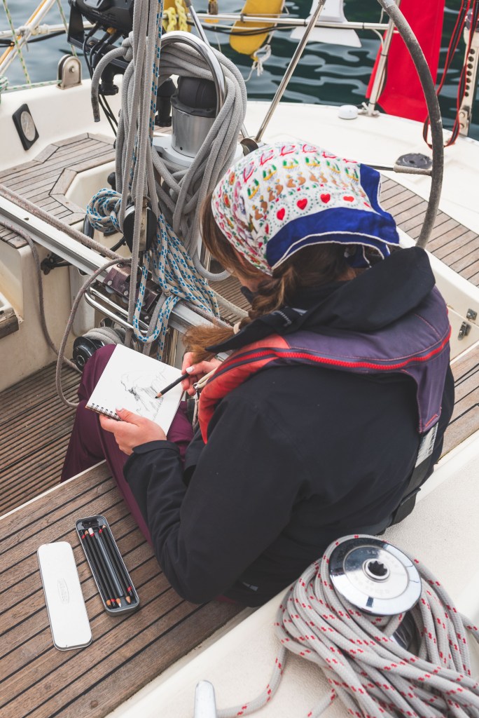 The wind and ocean conditions varied a little bit everyday and we had to learn to work together as a team, to be on the lookout, to feed each other, to get to a destination in time. Some days, the wind was virtually non-existent which meant motoring and using fuel. During those times, we rested, worked on our artistic practices and exchanged stories. On other days, the boat would be flying with the winds and we would feel the exhilaration and the (sometimes) terror of feeling the boat tilt sideways to the water’s surface as we surfed the waves.Anna would sometimes inject some creative exercises to help us get more in tune. Oliver and Tom (First Mate) were amazing. They showed all of us how to operate the sailboat safely. We all gained confidence in being a supportive member of a competent crew. All of us got a chance to steer the boat, how to read the water and wind and the environment and also- how to control our own nervousness and fear.